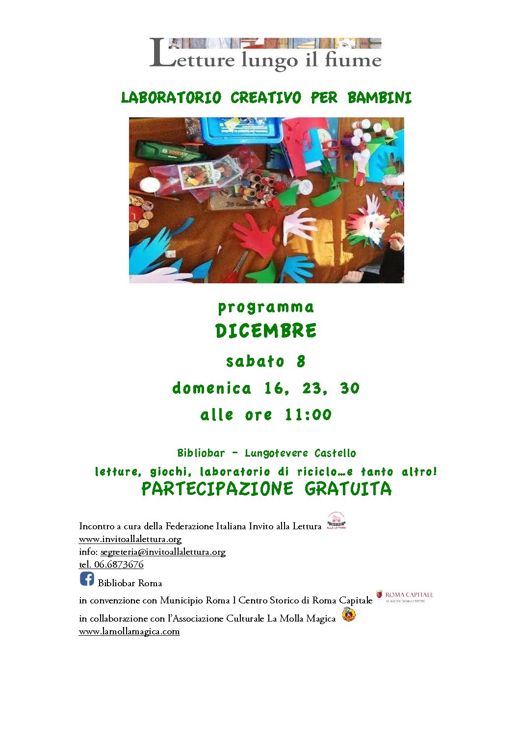 Laboratorio creativo per Bambini: alle 11:00 letture, spazio morbido per i più piccini, laboratorio creativo di riciclo, giochi e tanto altro! La partecipazione è gratuita e adatto ai Bambini dagli 8 mesi agli 8 anni. A cura della Federazione Italiana Invito alla Lettura, in collaborazione con l’Associazione Culturale La Molla Magica.