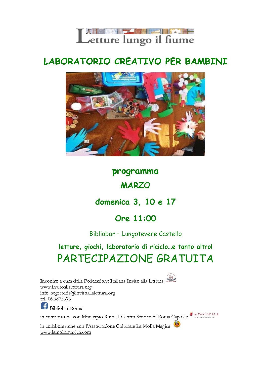 Laboratorio creativo per Bambini: alle 11:00 letture, spazio morbido per i più piccini, laboratorio creativo di riciclo, giochi e tanto altro! La partecipazione è gratuita e adatto ai Bambini dagli 8 mesi agli 8 anni. A cura della Federazione Italiana Invito alla Lettura, in collaborazione con l’Associazione Culturale La Molla Magica.